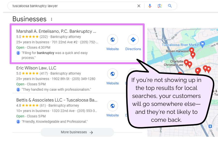 Maybe you’re thinking, “I don’t care about SEO or optimization” but before you write it off, let’s discuss why it matters for Bankruptcy Attorney Marketing. Local search optimization makes it easier for people in your area to find your bankruptcy practice. In other words, using and saying the right words and phrases on your website is crucial to having you rank ahead of your competition when a person in need of your services types in “Bankruptcy attorney near me” in their Google Search Bar.
