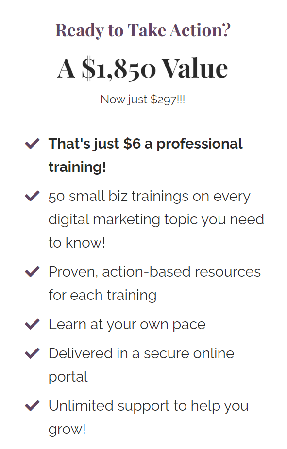 Inside this incredible training program, you will get FIFTY (50) action-focused, bite-sized trainings that will help you get results FAST!
